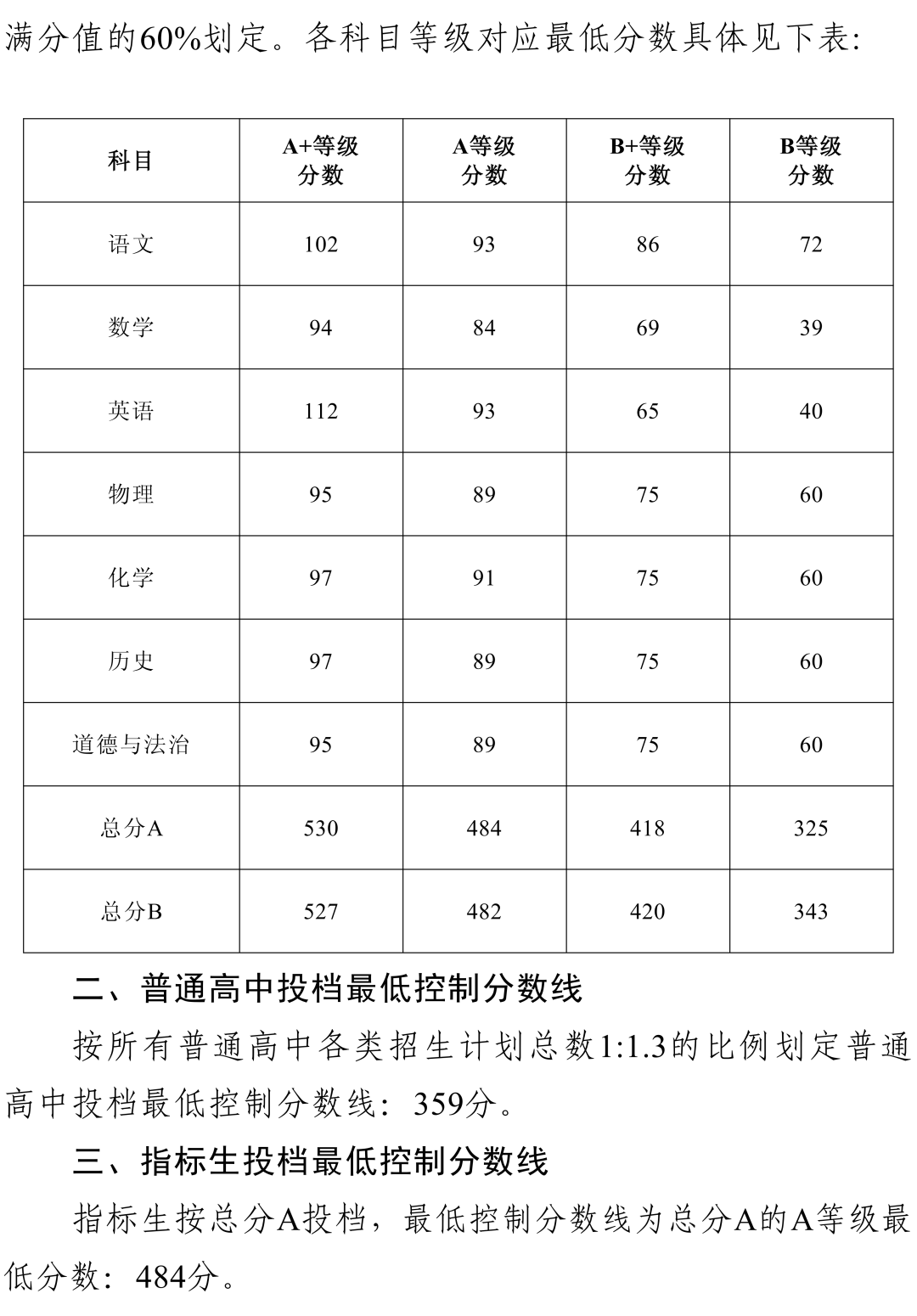 今年中考總分滿分為600分,按所有普通高中各類招生計劃總數(shù)1:1.3的比例劃定普通高中投檔最低控制分?jǐn)?shù)線,為359分。指標(biāo)生按總分A投檔,最低控制分?jǐn)?shù)線為總分A的A等級最低分?jǐn)?shù),為484分。