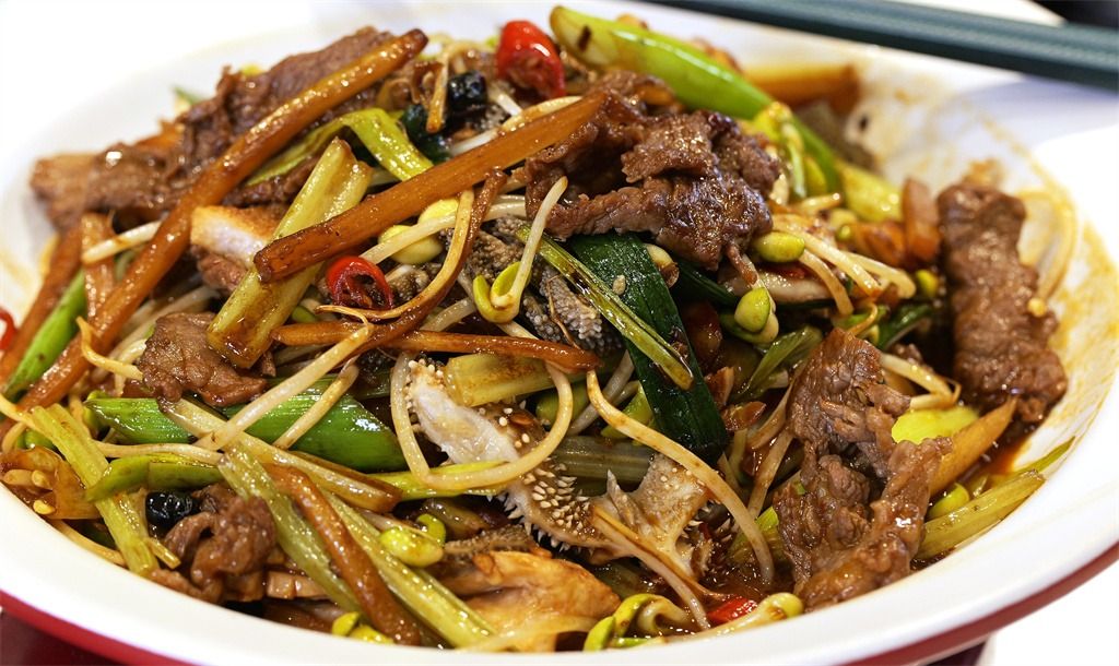 廣西的老友粉大家都知道,所以這里也有一道老友炒鮮牛雜煲。酸筍、豆芽、辣椒……各種料頭轟轟烈烈地堆成一鍋,伴著牛雜,酸辣勁道。權(quán)記興致勃勃地講起“老友”的來歷:傳說廣西老友,一天宿醉,將家中剩菜雜燴一炒,即成美味。只有老友,才不嫌棄這般隨便?!八越裉煳覀円黄鸪粤诉@個(gè),也算是老友了!”