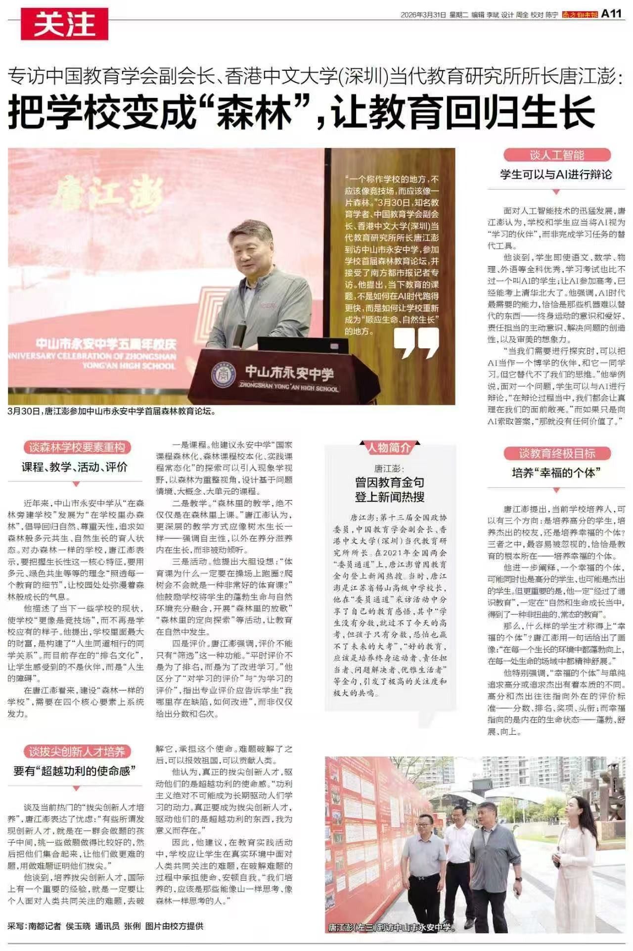 “一個稱作學(xué)校的地方,不應(yīng)該像競技場,而應(yīng)該像一片森林?!?月30日,知名教育學(xué)者、中國教育學(xué)會副會長、香港中文大學(xué)(深圳)當(dāng)代教育研究所所長唐江澎到訪中山市永安中學(xué),參加學(xué)校首屆森林教育論壇,并接受了南方都市報記者專訪。他提出,當(dāng)下教育的課題,不是如何在AI時代跑得更快,而是如何讓學(xué)校重新成為“順應(yīng)生命、自然生長”的地方。