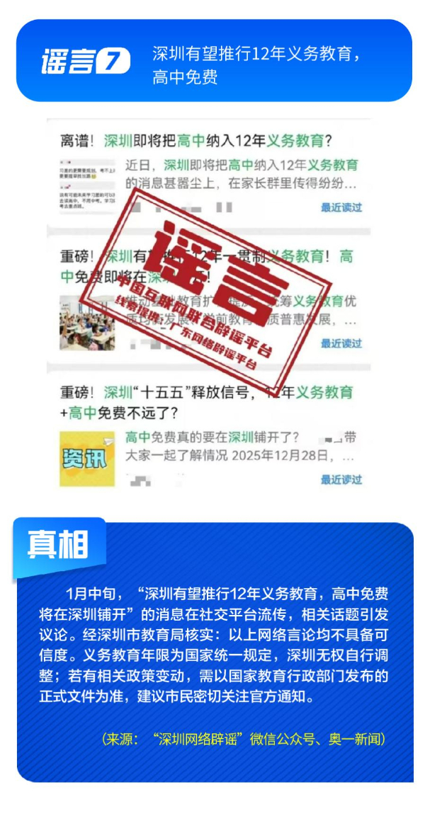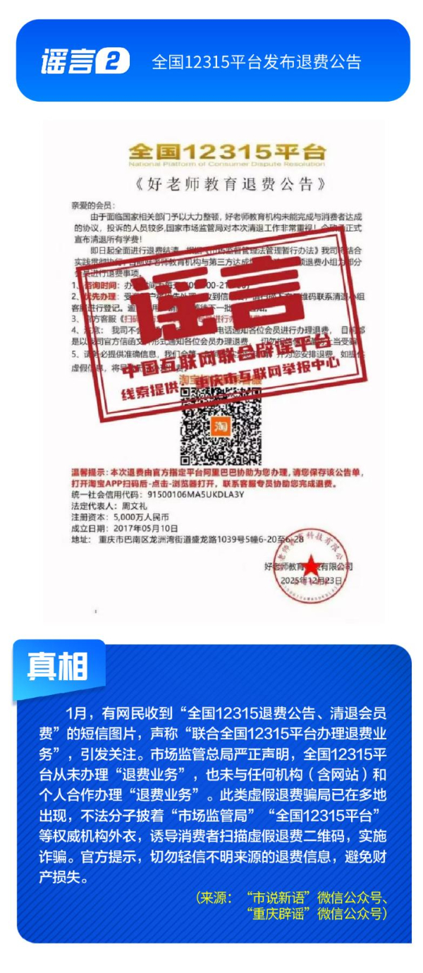 公共政策領域謠言誤導公眾決策?!吧绫?]有有效期限制、未到期不能換新卡”是對社??ü芾碚叩恼`讀,給民眾平添困擾;“28家博物館元旦期間閉館”實為少數博物館根據運營安排所做的微調,網帖嚴重夸大實際閉館情況,引發(fā)負面炒作;“深圳有望推行12年義務教育,高中免費”是對現(xiàn)行政策的“超前編造”,誤導學生及家長群體;“全國12315平臺發(fā)布退費公告”,則是假冒監(jiān)管機構名義散播不實通知,為后續(xù)詐騙行為做鋪墊。