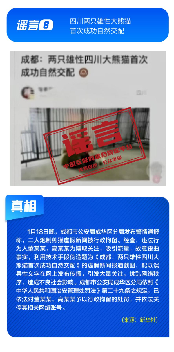 針對各類網絡謠言與亂象,多部門開展協(xié)同治理,聯(lián)動整治。1月16日,中央網信辦召開全國網絡辟謠聯(lián)動機制第三次全體會議,部署以辟謠工作新成效助力清朗網絡空間建設。中央網信辦聯(lián)合工業(yè)和信息化部等部門持續(xù)整治汽車行業(yè)網絡亂象,處置一批涉嫌挑動對立、炒作負面話題、違規(guī)測評的賬號;國家廣播電視總局開展“AI魔改”視頻專項治理,各平臺處置大量違規(guī)內容。各地網信部門積極行動,陜西西安深入開展房地產領域網絡專項行動,處置散布樓市謠言的房產中介賬號,四川成都依法處置30余個惡意關聯(lián)地域、污名化城市的違規(guī)賬號。公安機關依法打擊造謠傳謠人員。擺拍“小女孩在學校跳蚤市場用50元淘到名酒”、利用AI偽造“假救護車非法轉運”、編造“兩只雄性四川大熊貓首次成功自然交配”等謠言的相關責任人已依法被予以行政處罰。