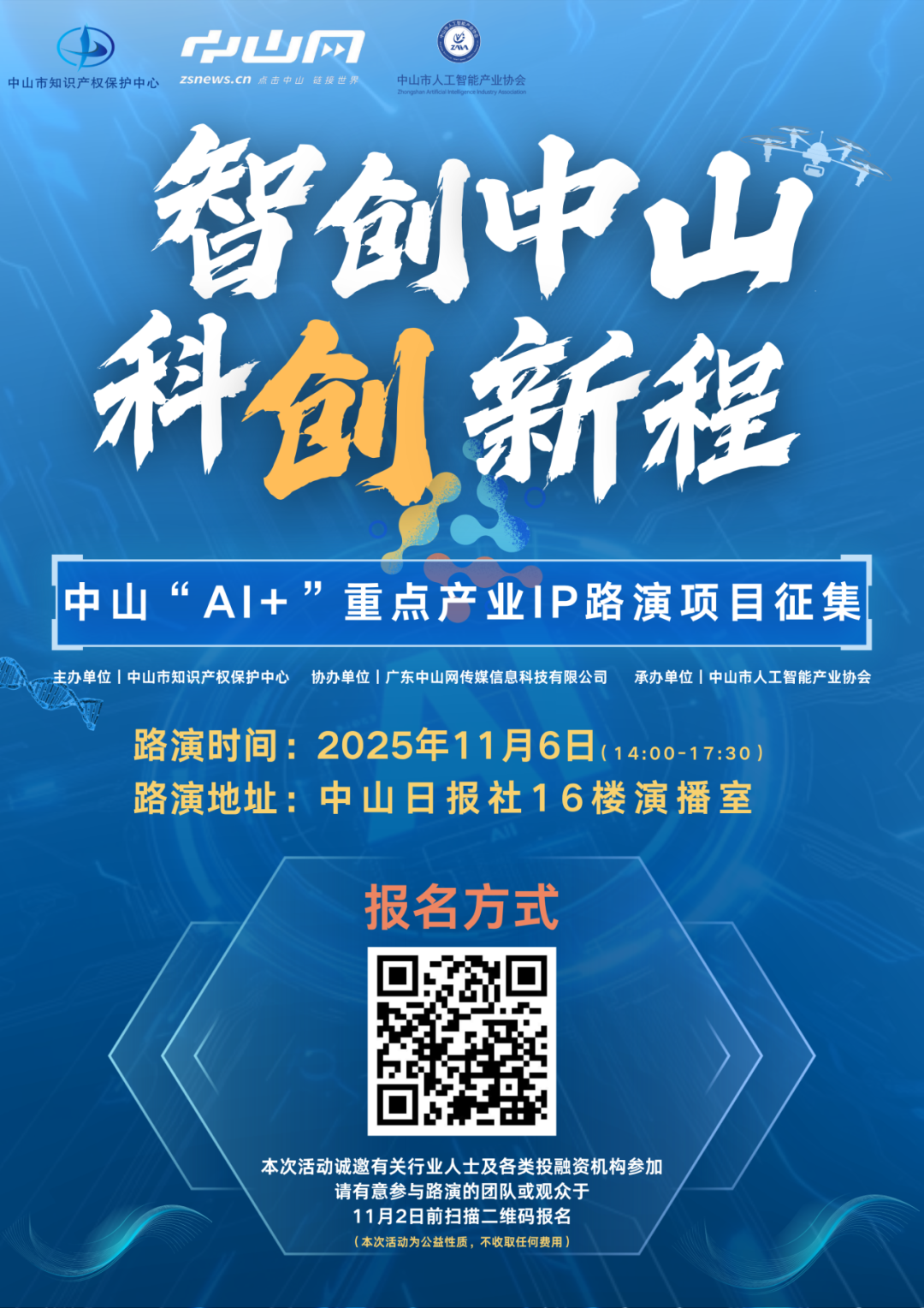 為助力我市加快培育壯大新興產(chǎn)業(yè)、前瞻布局未來(lái)產(chǎn)業(yè),推動(dòng)企業(yè)技術(shù)需求與高校、科研院所專利成果精準(zhǔn)對(duì)接,打通專利轉(zhuǎn)化關(guān)鍵環(huán)節(jié),進(jìn)一步激發(fā)創(chuàng)新活力、拓寬產(chǎn)業(yè)融資渠道,中山市知識(shí)產(chǎn)權(quán)保護(hù)中心將于11月6日(周四)舉辦中山市“AI+”低空經(jīng)濟(jì)、生物醫(yī)藥產(chǎn)業(yè)知識(shí)產(chǎn)權(quán)項(xiàng)目路演活動(dòng)?,F(xiàn)面向全市各類創(chuàng)新主體,廣泛征集相關(guān)領(lǐng)域的知識(shí)產(chǎn)權(quán)路演項(xiàng)目。