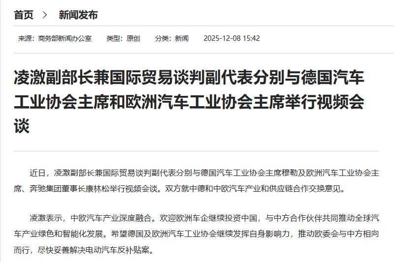 近日,凌激副部長兼國際貿(mào)易談判副代表分別與德國汽車工業(yè)協(xié)會(huì)主席穆勒及歐洲汽車工業(yè)協(xié)會(huì)主席、奔馳集團(tuán)董事長康林松舉行視頻會(huì)談。雙方就中德和中歐汽車產(chǎn)業(yè)和供應(yīng)鏈合作交換意見。